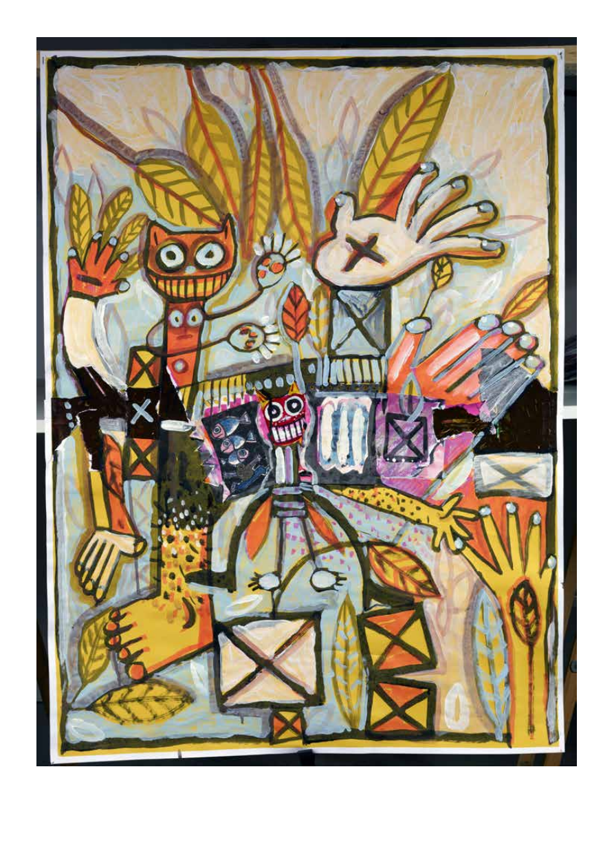 "Formes et couleurs se baladent à la rencontre de l'insaisissable, de l'interdit. Elles cheminent sur de branlants supports. De ce chaos accouchent incidents et territoires inconnus. Ce fragile chahut posé sur d'instables papiers et cartons déchus va se réveiller. Tenez-vous aux aguets !"